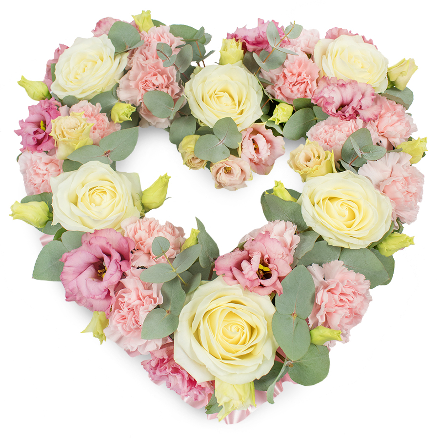 Express your enduring love with our Timeless Open Heart Tribute Bouquet. This elegant arrangement features a blend of white roses, pink carnations, pink lisianthus, and eucalyptus leaves, offering a unique and heartfelt tribute.